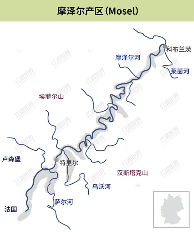 德國是雷司令的原產地和最經典的產區,其雷司令種植面積居世界第一。這里星羅棋布的13個葡萄酒產區內幾乎都種植了雷司令,其中最經典的是摩澤爾(Mosel)、萊茵高(Rheingau)和法爾茲(Pfalz)三大產區。