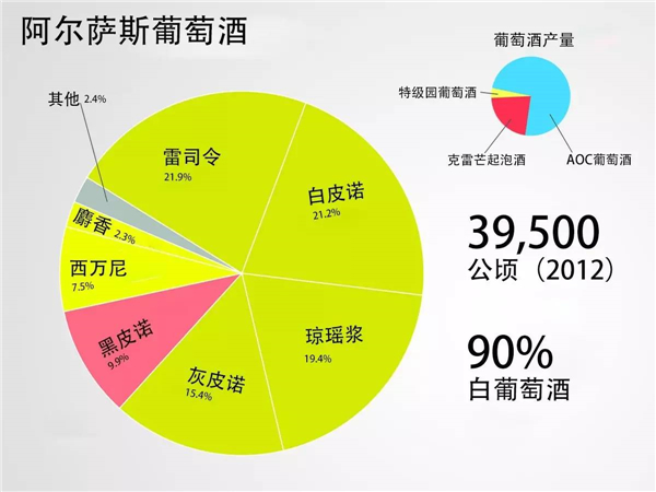 阿爾薩斯產(chǎn)區(qū)最尊貴的葡萄品種是雷司令(Riesling)、灰皮諾(Pinot Gris)、瓊瑤漿(Gewurztraminer)以及麝香葡萄(Muscat)。阿爾薩斯的葡萄酒通常口感濃郁,帶有礦物質(zhì)味,并不是這些葡萄品種一般擁有的清新果味。