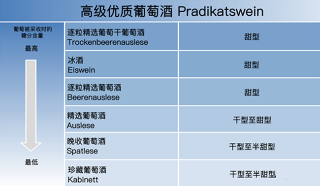 在德國,PDO葡萄酒的產量最大,而其中高級優質葡萄酒占有非常重要的地位。由于氣候寒冷,葡萄的成熟度對于德國葡萄酒來說至關重要,于是法律根據葡萄采收時的成熟度,又將高級優質葡萄酒細分為以下6個等級。別看它很復雜,但只要將這一分級看做葡萄酒的風格劃分,理解起來就很容易了。