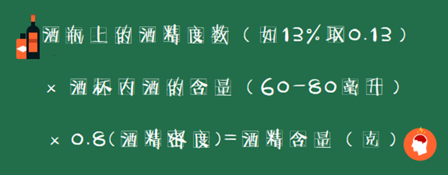 大家常飲用的葡萄酒度數(shù)一般為11 - 13%,按照不超過酒杯1/3的倒酒標準,一杯葡萄酒通常有60 - 80毫升。按下圖計算公式,喝一杯葡萄酒,你將攝入5 - 8克酒精。