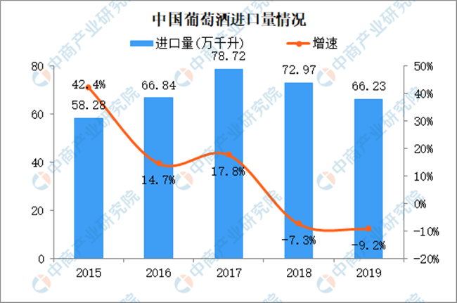 2015-2017年葡萄酒進(jìn)口量穩(wěn)步上漲,但是增速放緩。此后兩年葡萄酒進(jìn)口量持續(xù)下降,2019年葡萄酒進(jìn)口量跌至2016年水平,進(jìn)口量66.23萬(wàn)千升,同比減少9.2%。