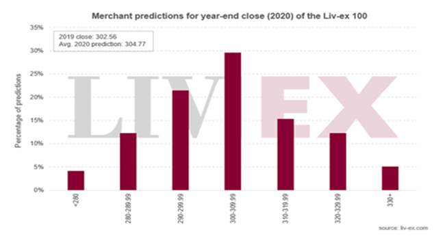 今年,Liv-ex會(huì)員預(yù)測(cè)優(yōu)質(zhì)葡萄酒市場(chǎng)將在2020年持平。平均而言,受訪者預(yù)測(cè)此行業(yè)基準(zhǔn)指數(shù)將上升0.7%,收于304.77點(diǎn)。 預(yù)測(cè)的中位數(shù)則稍低,為303.00點(diǎn),上升0.1%。