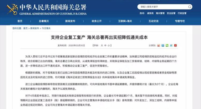 海關總署3月10日在其官網發布《支持企業復工復產 海關總署再出實招降低通關成本》的文章。