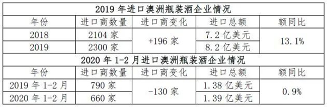 今年1-2月,盡管疫情對行業有一定沖擊,但澳洲瓶裝酒進口頭部企業基本穩住陣腳。雖然進口額≥1000萬美元的企業僅1家,少于去年同期,但其進口額同比增長近30%;而進口額≥500萬但小于1000萬美元的企業有2家,數量增加,其中,1家進口額實現倍數增長,1家為新的行業進入者。