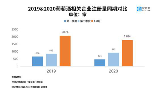 企查查數(shù)據(jù)顯示,今年上半年,我國葡萄酒相關(guān)的企業(yè)共注冊了1396家,同比下降7.9%。其中一季度注冊量為473家,二季度注冊量增長到923家。今年1-8月,我國葡萄酒相關(guān)企業(yè)的注冊量是1784家,同比下降14%。