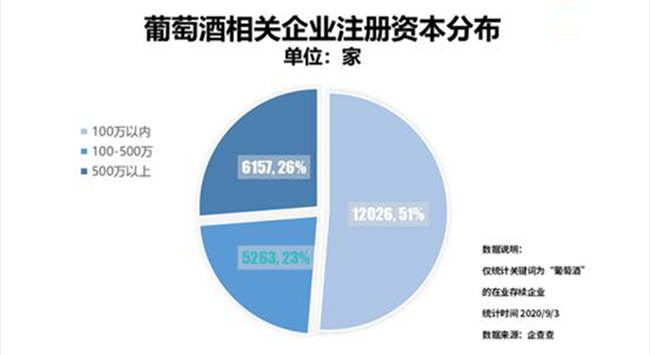 從企業(yè)注冊資本分布來看,我國有一半的葡萄酒企業(yè)注冊資本在100萬以內(nèi),共1.2萬家,占比企業(yè)總量的51%;注冊資本在100-500萬之間的企業(yè)數(shù)量最少,僅0.5萬家,占比企業(yè)總量的23%。