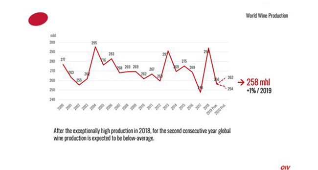 在經歷了2018年異常高的產量后,預計全球葡萄酒產量將連續第二年低于平均水平。