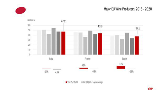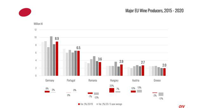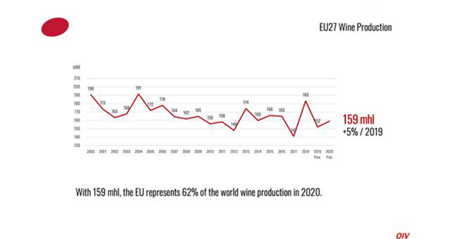 北半球2020年的采收并未受到因疫情封鎖措施的強烈影響。2020年,歐盟國家葡萄酒產量為159億升(mhl),占全球總產量的62%。