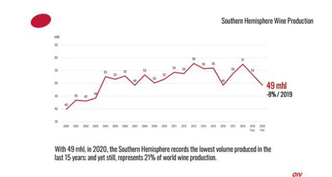 2020年,南半球的產量為49 億升(mhl),為過去15年的最低水平,仍占全球葡萄酒產量的21%。