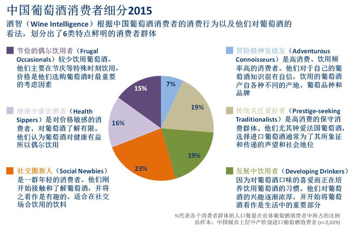 針對(duì)中國(guó)的3800萬進(jìn)口葡萄酒消費(fèi)者,酒智(Wine Intelligence)劃分出了6類特點(diǎn)鮮明的消費(fèi)者類別。除了上述提及的 “發(fā)展中飲用者”(Developing Drinkers),其他5類包括“冒險(xiǎn)精神發(fā)燒友”(Adventurous Connoisseurs)、“傳統(tǒng)名莊愛好者”(Prestige-seeking Traditionalists)、“社交圈新人”(Social Newbies)、“健康少量飲酒者”(Health Sippers)和“節(jié)儉的偶爾飲用者”(Frugal Occasionals)。酒智(Wine Intelligence)的消費(fèi)者劃分不僅基于年齡、性別和收入等基本信息,還涉及消費(fèi)者的購買飲用行為以及他們對(duì)于葡萄酒的看法,包括:他們?yōu)楹物嬘闷咸丫疲绾巫龀鲑徺I決定,以及飲用何種葡萄品種和產(chǎn)地等等。