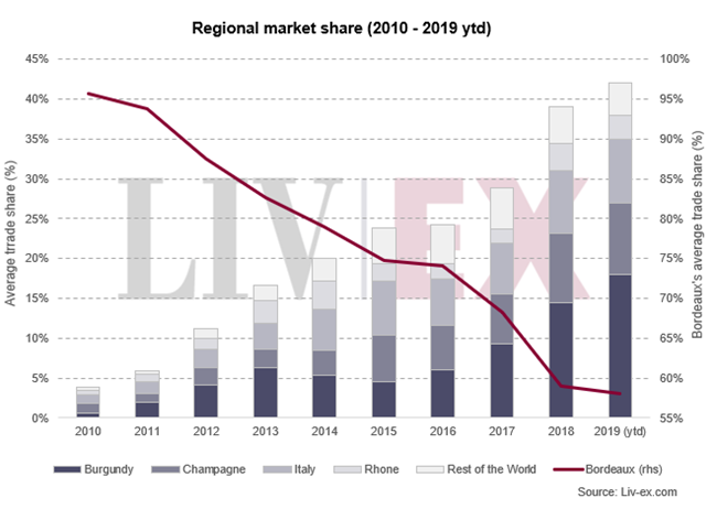 在2018年度報告中,我們發(fā)現(xiàn)優(yōu)質(zhì)葡萄酒市場不斷擴(kuò)大,買家對更多不同酒區(qū)的葡萄酒的興趣不斷增加。2019年至今,除了這多元化的趨勢繼續(xù)保持,勃艮第的交易份額也創(chuàng)新高。