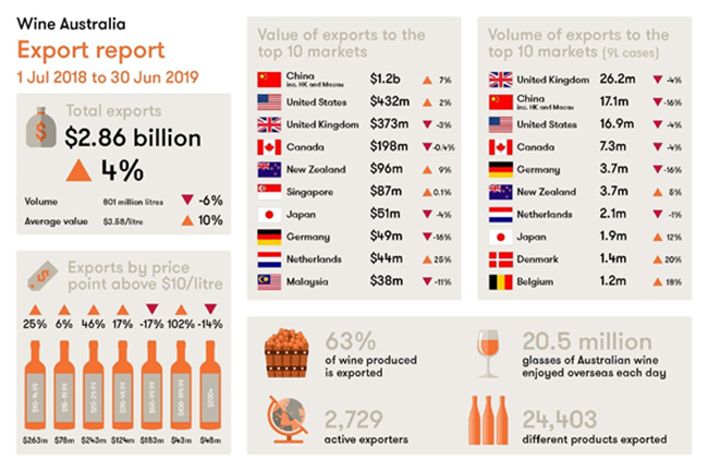 截至2019年6月底的12個月中,澳大利亞葡萄酒的出口總額增長了4%至28.6億澳元。其中,對中國市場的出口額持續增長7%,創下12億澳幣新高。