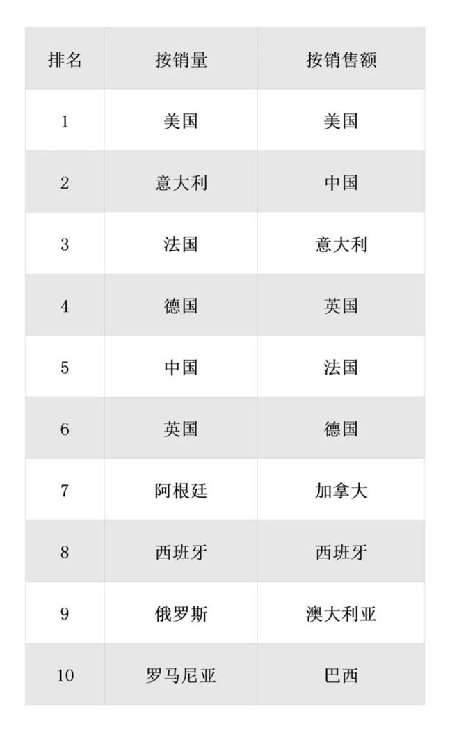 按銷售額計算,排名有更多的變動。意大利從第5位上升到第3位,英國從第3位下降到第4位,法國從第4位下降到第5位。西班牙和澳大利亞分列第8和第9位,巴西取代日本,躍居第10位。