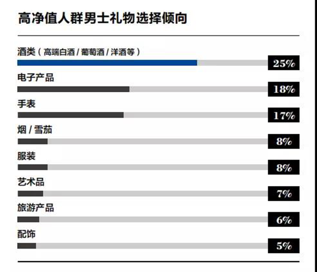 25%的高凈值男士喜歡選擇酒類作為禮物進行贈送。這種現(xiàn)象也反映在收藏領域。