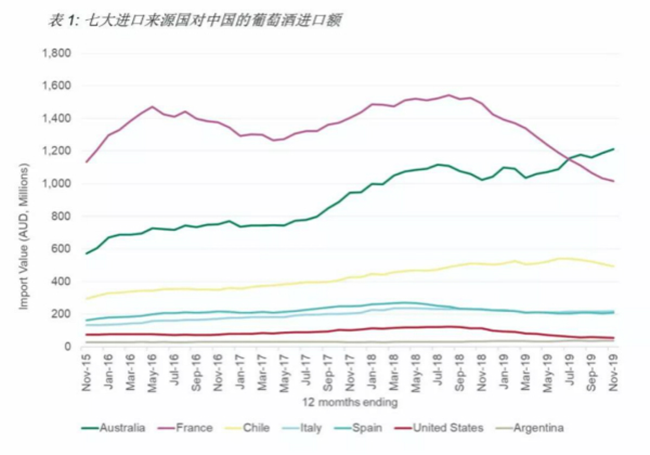 截至2019年12月底的12個月中,澳大利亞葡萄酒對中國市場(包括香港和澳門)的出口額增長12%,創下12.8億澳元新高,出口量下滑17%至1.42億升 (等量于1580萬箱9升裝)。平均出口額增長35%至8.99澳元(每升離岸價)。澳大利亞葡萄酒對中國市場的出口總額及平均出口額雙雙創下了年度新高。