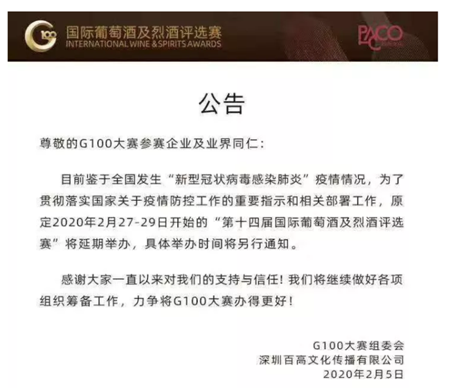 日前,G100大賽組委會以及深圳百高文化傳播有限公司發(fā)出公告,原定于在2月27-29日開始的“第十四屆國際葡萄酒及烈酒評選賽”也將延期舉辦,具體舉辦時間將另行通知。