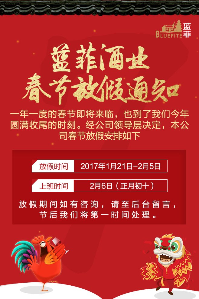 值此2017新春佳節(jié)即將到來之際,藍(lán)菲酒業(yè)全體員工恭祝您和您的家人:闔家幸福,吉祥安康!2017更加輝煌!